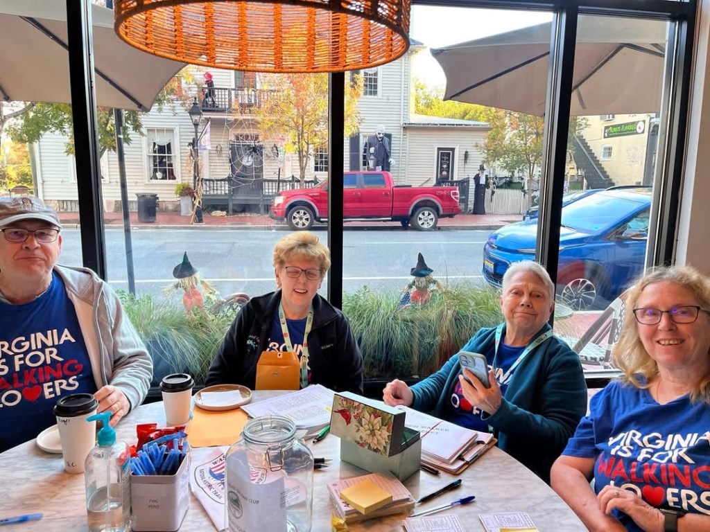 The weather was perfect for FWC’s one-day Traditional Walk on October 25th, 2025, in downtown Fredericksburg, VA, called the “Palooza”. We gave it that title because walkers had the opportunity to walk through historic Fredericksburg past eight AVA Special Program sites (including Step to the Beat, Walking with America’s Veterans, Washington-Rochambeau Trail, Grain Elevators, Walking with the Wild Things, Town Hall/City Hall, and Rails to Trails). It was also a day for Trick or Treating downtown and we saw so many fun costumes and people having fun! Many thanks to the wonderful staff at Anita’s Cafe for letting us set up our start/finish table there.