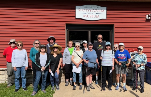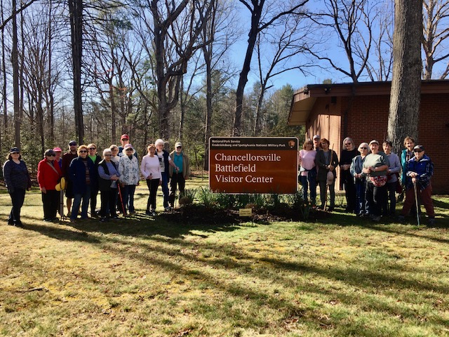 We had a great turnout of 26 people on a very enjoyable 4+-mile walk on Chancellorsville Battlefield trails, led by club member Beth Hudson Stenstrom. Walking on our area’s numerous battlefields is a walk through history. We walked by the area where Stonewall Jackson was mortally wounded by “friendly fire;” also by earthworks, the ruins of the Chancellor House, and the site of the Bullock House. There are many descriptive signs along the way, talking about events that happened during that battle. Afterwards, a bunch of us had a good time eating and talking at Harry’s Ale House.