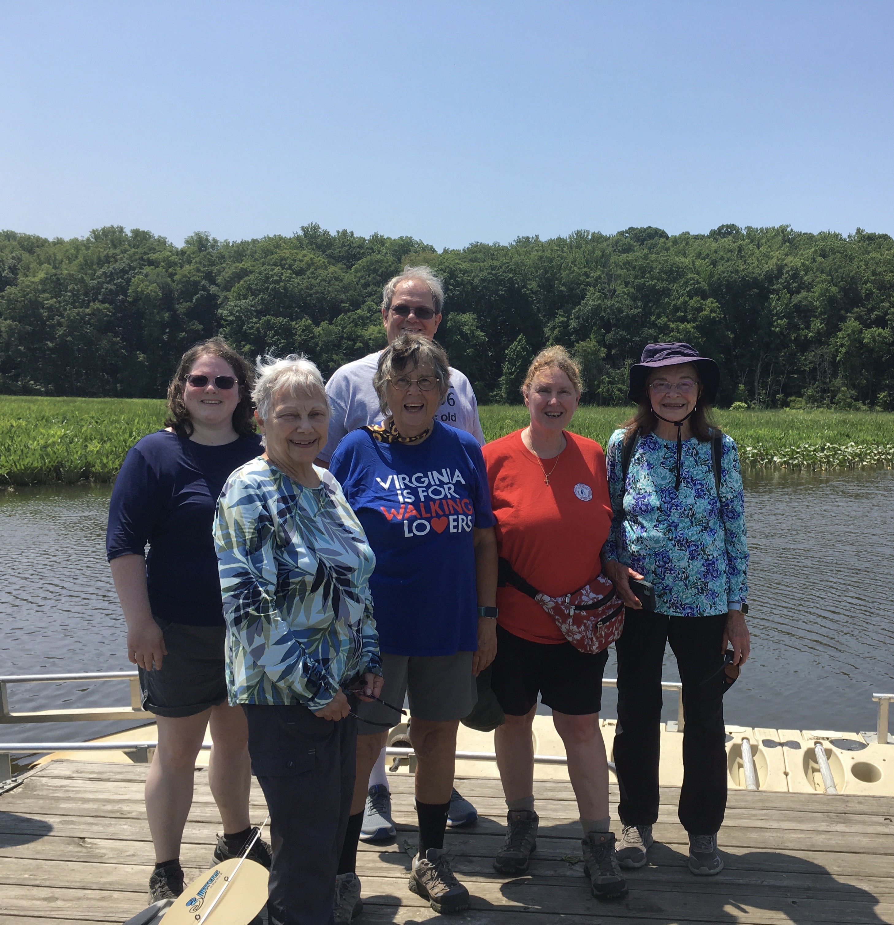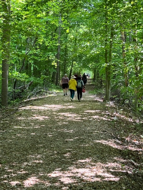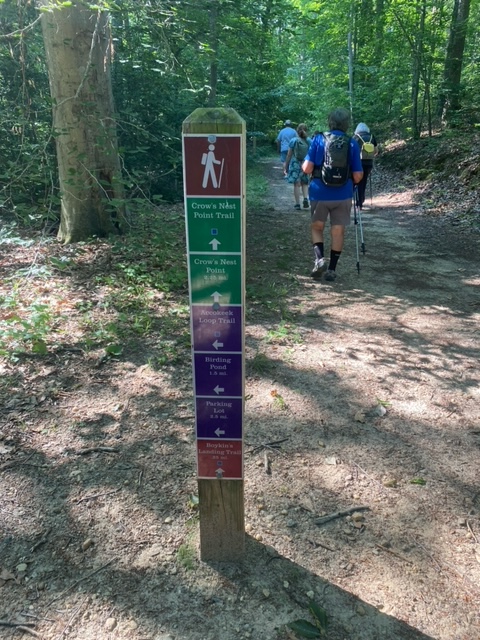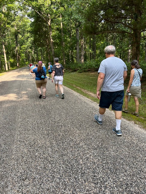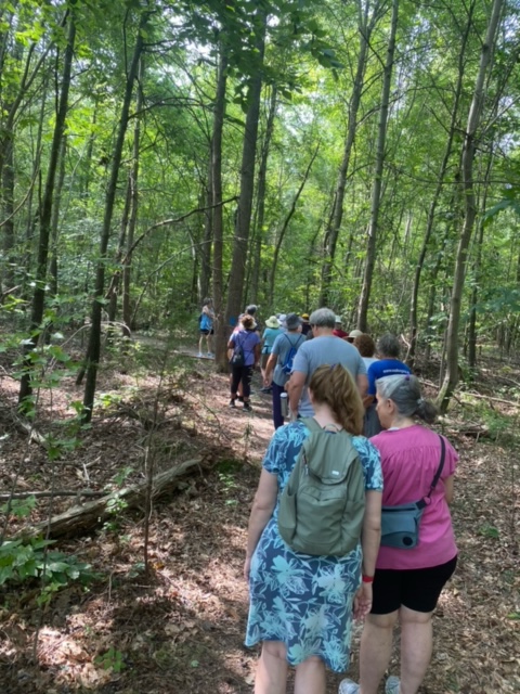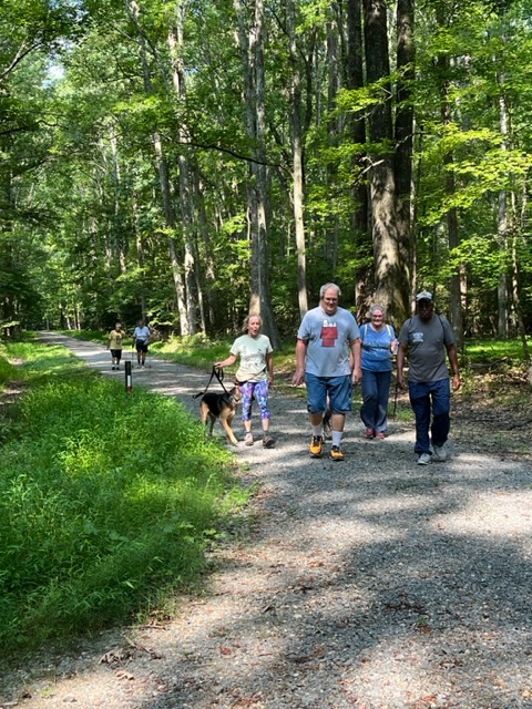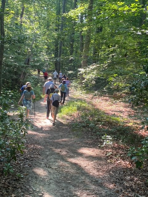 Our amazing and fun group of 24 walkers trekked about 3.5 miles on the Boyd’s Hole Trail in Caledon State Park. It was a beautiful morning, although hot and humid, so we were happy that the trail was very shady. Friends of Caledon State Park member, Laura Schlemm, joined us and gave us some wonderful background info on the park. Her sweet dog, Chague, was a perfect gentleman the entire way. Afterwards, we drove to the Machodoc Marina and Cafe for a delicious lunch and great view of the water. Looking forward to going back to the park and cafe again sometime!