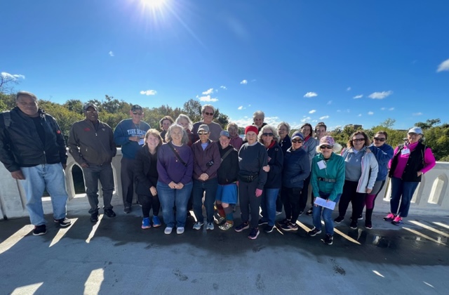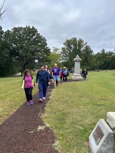 Twenty-one wonderful walkers trekked 5+ miles on parts of the Spotsylvania Courthouse Battlefield Trail. It was a great weather day for a walk through this beautiful place on paved roads and man-made/natural trails. Stopping to read and look at the many informative signs and monuments throughout really brings this important Civil War battle to life. Afterwards we enjoyed a fantastic lunch at the Itavie New York Grill & Bakery.