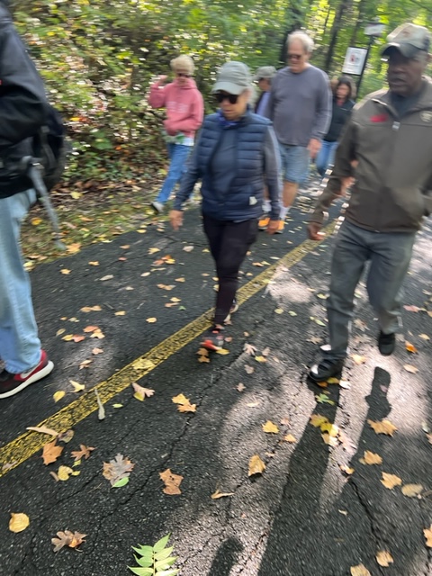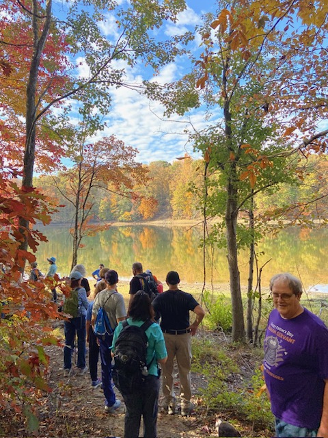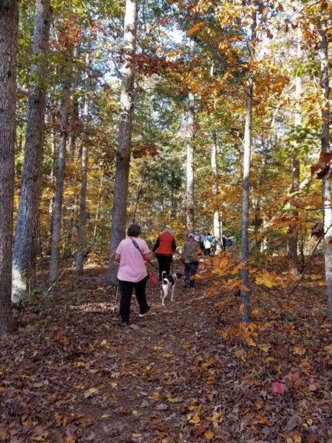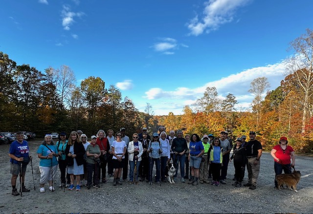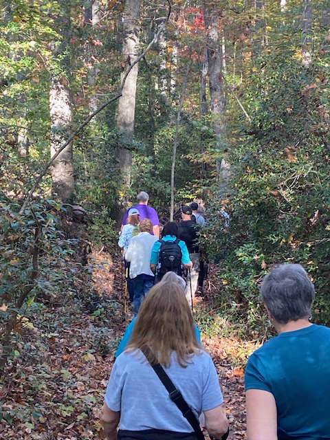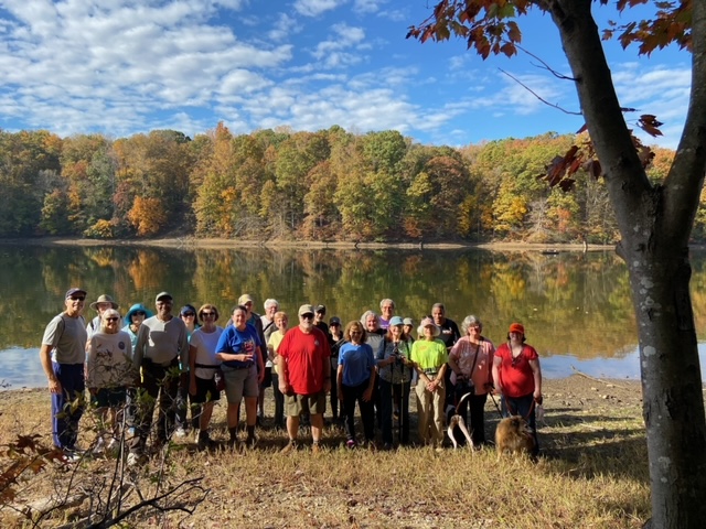 Saturday morning 31 amazing walkers, undaunted by steep hills, hiked portions of Turkey Ridge Trail and Mine Run Trail at Motts Run Reservoir in Spotsylvania County. It was a perfect day for a hike through the woods – beautiful weather and gorgeous fall colors. Afterwards, the fun continued with a group of 17 having a good lunch and conversation at Cracker Barrel. Thanks to all who joined us!