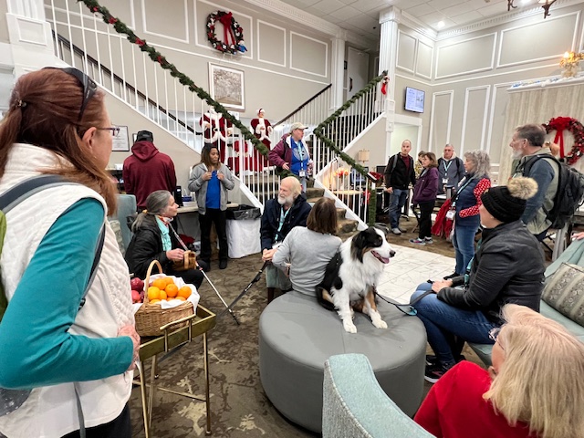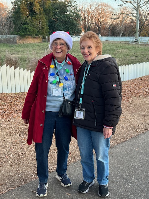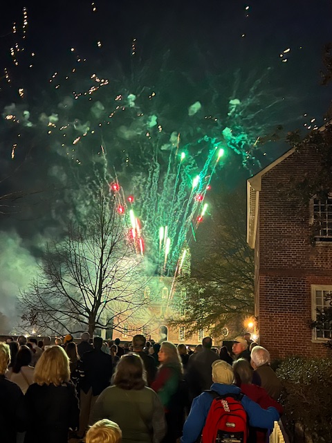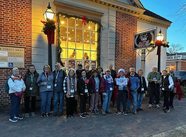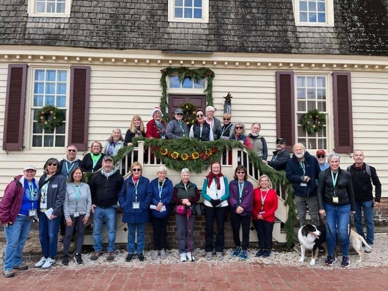 On Friday, December 8th, 2023, thirty-plus FWC members travelled to Williamsburg, VA, and enjoyed an amazing weekend walking around the Historic District. This annual Walk Fest is hosted by the Peninsula Pathfinders who map out both night and day walks for Friday through Sunday. We all went on numerous walks and logged in many kilometers while having a lot of fun. Some wonderful activities included on Friday night, watching the arrival of the Yule Log preceded by the Fife and Drum Corps, then throwing pine sprigs into the fire making wishes for the New Year. Saturday night we enjoyed wonderful entertainment by carolers, hand bells, street musicians and theater, and more. The night ended with a spectacular show of fireworks called the Grand Illumination. There was so much more! The photos give a glimpse of our great weekend.