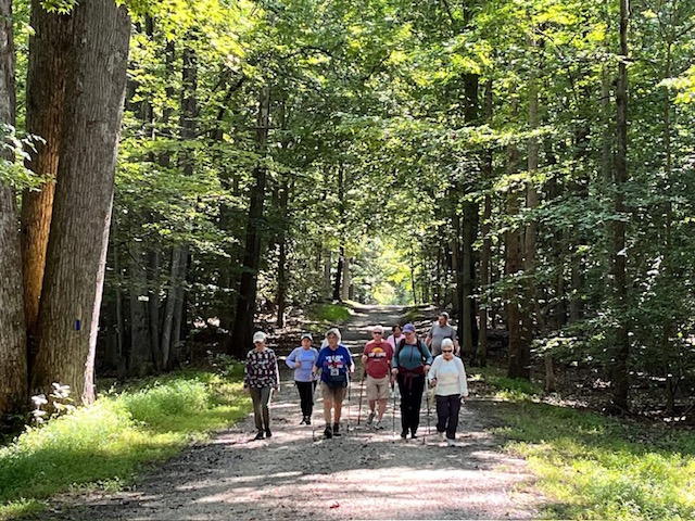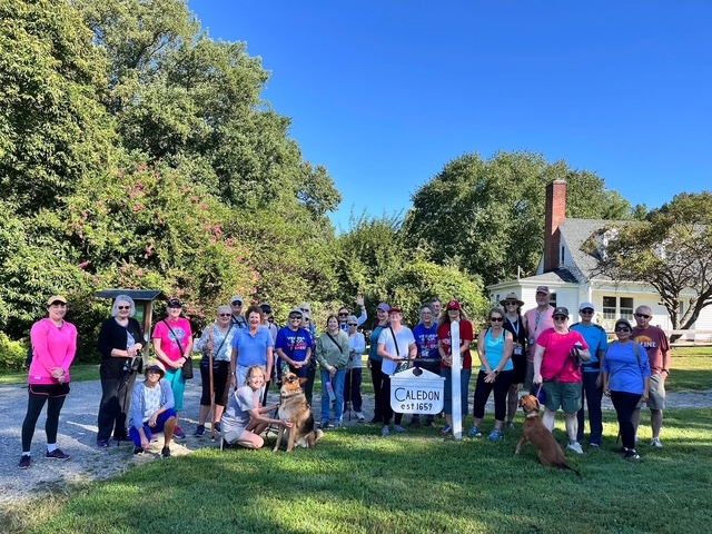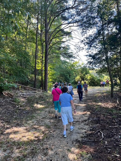 Our club enjoyed a lovely hike on the Boyd’s Hole Trail in Caledon State Park on August 23rd, 2025. Around 30 walkers went a little over 5K on this beautiful trail that leads to the Potomac River. We were fortunate to have Laurie Schlemm, who’s with the Friends of Caledon State Park, as our tour guide. She shared great stories and background information about the park. Everyone loved walking and talking and afterwards had a delicious lunch at the Machodoc Creek Marina and Cafe.